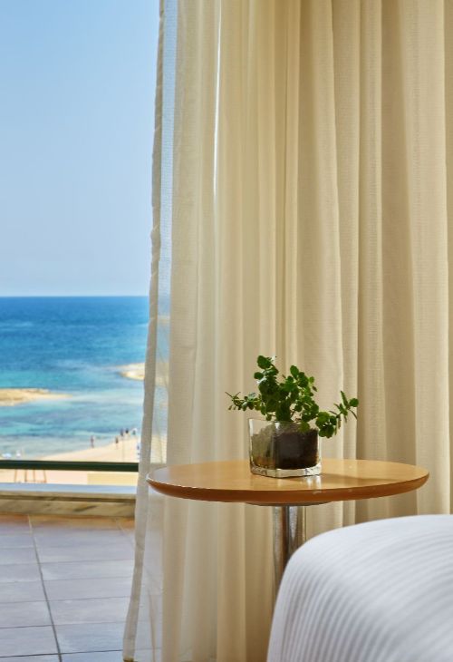 The Superior Family rooms are located in the main building, are modernly styled, and complemented by inspiring views of the Gulf of Malia. The full glass door opens out to the furnished private balcony.
