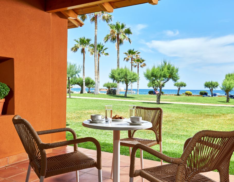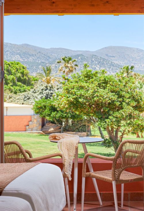 The Superior Family rooms are located in the main building, are modernly styled, and complemented by inspiring views of the Gulf of Malia. The full glass door opens out to the furnished private balcony.